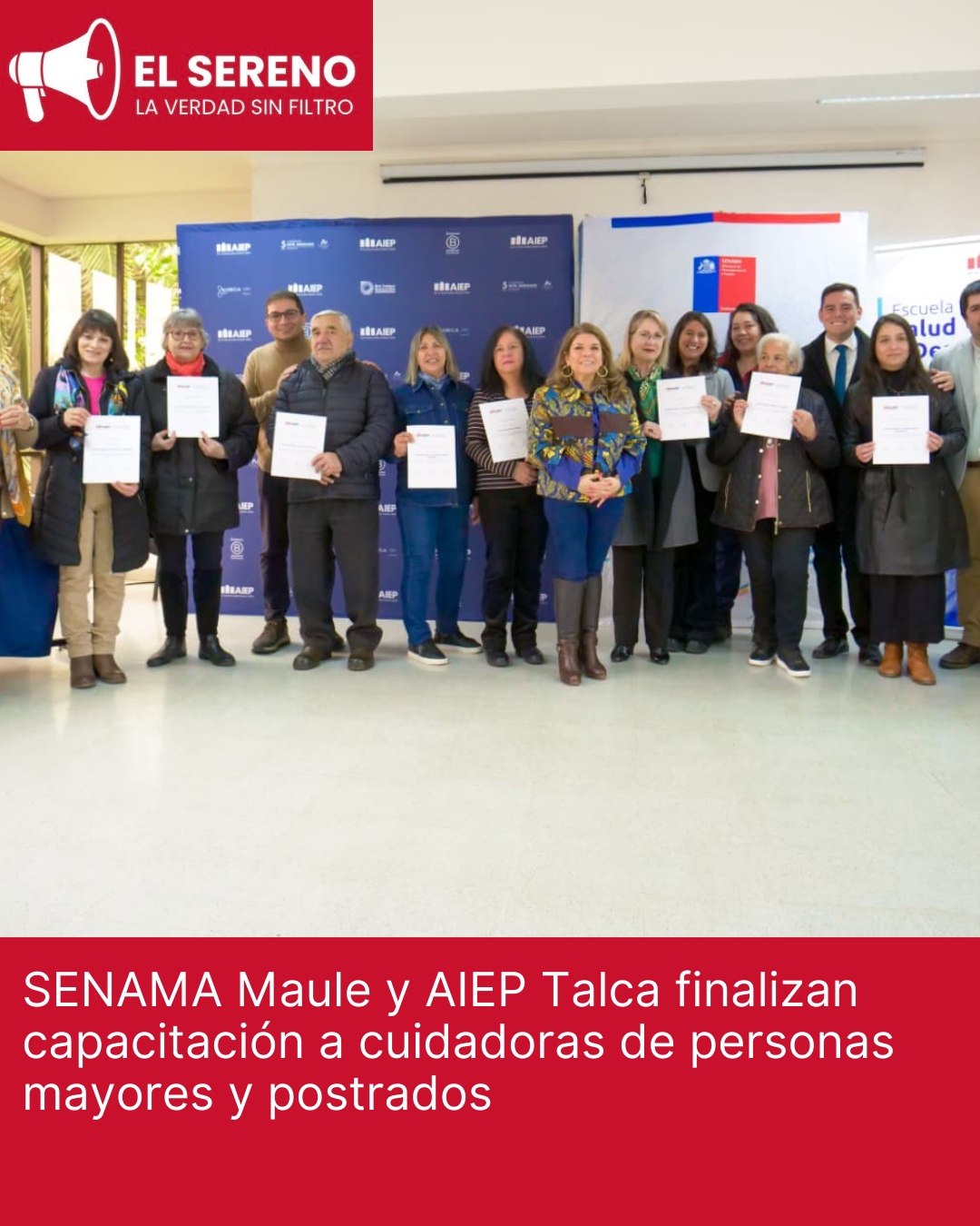 Con una emotiva ceremonia, el Servicio Nacional del Adulto Mayor (SENAMA) Maule y el Instituto Profesional AIEP Talca dieron cierre al proceso de capacitación dirigido a cuidadoras y cuidadores de personas mayores y en condición de postrados de la región.